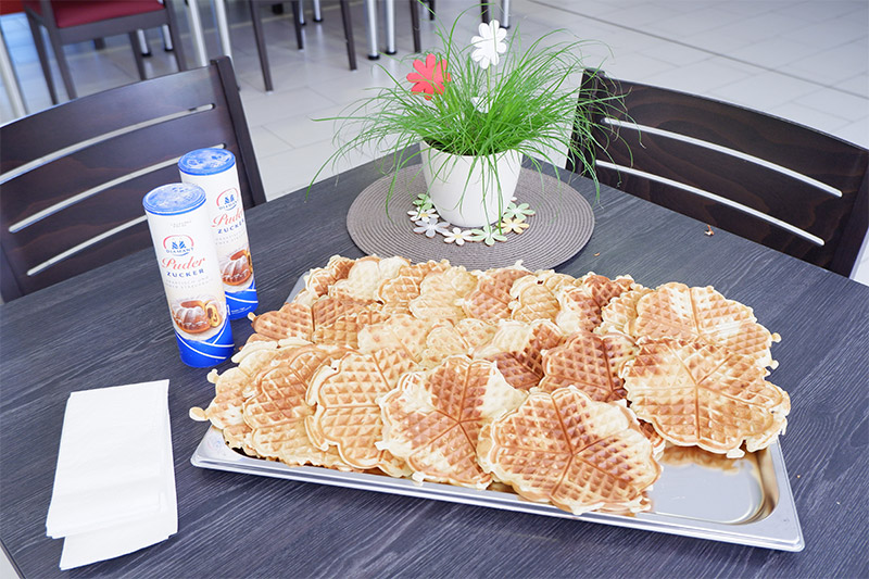 Waffeln satt! Zum Muttertag gab es für alle Bewohnerinnen frisch gebackenen Waffeln mit Sahne und Kirschen.