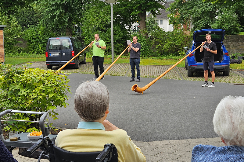 Einen besonderen musikalischen Abend erlebten die Bewohnerinnen und Bewohner des Hanse-Zentrums Soest. Drei Mitglieder der „Völlinghauser Alphornys“ gaben im Garten der Einrichtung ein rund 45-minütiges Konzert. Bei angenehmem Wetter, Getränken und kleinen Snacks lauschten die Teilnehmenden aufmerksam den tiefen, warmen Klängen der Alphörner. Für viele war es ein ungewöhnliches Erlebnis, diese Instrumente mitten in der Soester Börde zu hören.