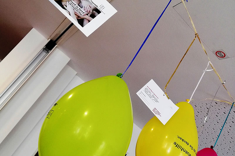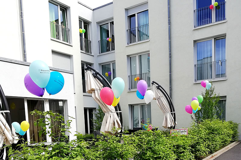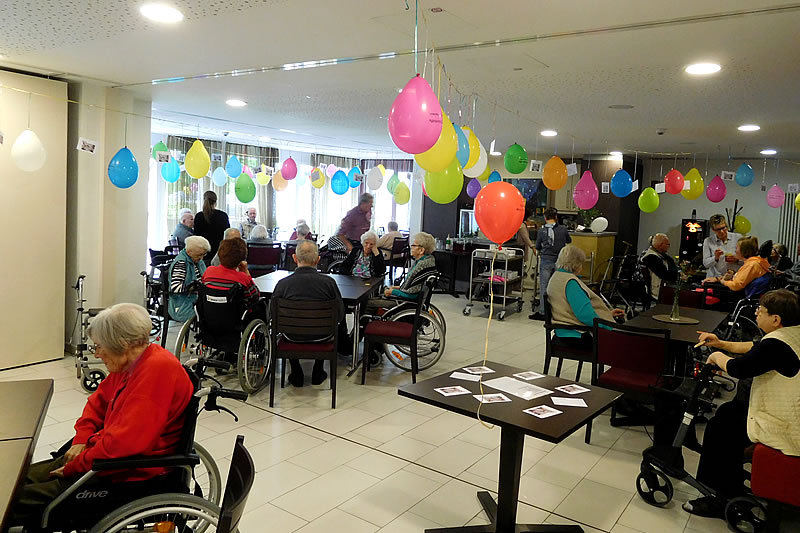Im Anschluss daran wurden die Ballontrauben rund um die jeweilige Einrichtung verteilt angebunden. „Es geht uns darum, zur Diskussion über die Pflege, die zukünftig gelten soll, zwischen Fachkräften und Betroffenen, zwischen Jung und Alt inhaltlich beizutragen und Anregungen zu geben“, erklärte Manuela Schunk, Öffentlichkeitsreferentin des Frauenverbandes. Fast 150 Aussage-Karten zur ‚Pflege der Zukunft‘ konnten mit Luftballons bestückt werden. Durch ihre Farbigkeit sollte die Vielfalt von Pflegeaspekten gezeigt werden. Überall entstanden Ballontrauben mit Aussagen zur Zukunft der Pflege. Diese bleiben hängen, solange sie der Witterung trotzen.