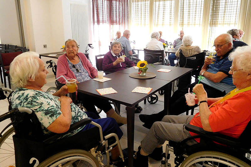 So wurde im Hand-um-drehen aus der Cafeteria eine Saft- und Cocktailbar. Anfang August entstand bei verschiedenen Säften und alkoholfreien Cocktails eine lockere Atmosphäre, bei der die Bewohnerinnen und Bewohner sich munter unterhielten und lange verweilten.