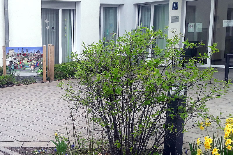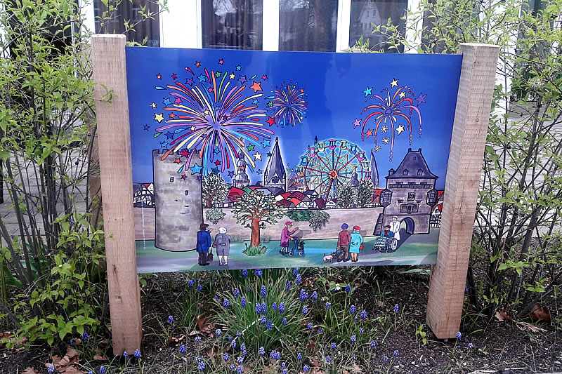 „Oh das ist ja die Soester Fehde! Und sieh mal hier, die Allerheiligenkirmes!“ Immer wieder kann man diese freudigen Ausrufe hören, wenn Menschen den Kasernenweg 11 in Soest betreten. Im Außenbereich des Alten- und Pflegeheimes, Hanse-Zentrum, stehen sie: zwei analog gezeichnete Bilder, digital bearbeitet und auf Alu-Bond gedruckte farbenfrohe Bilder, die an den Seiten von Eichenstehlen gehalten werden.