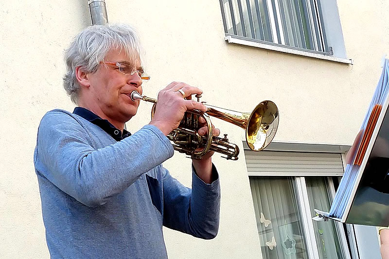 Bei geradezu sommerlichen Temperaturen lockten die Trompetenklänge von Arp Hinrichs viele im Hanse-Zentrum heraus. Ein gutes Dutzend der Bewohner*innen lauschten Ende April am offenen Fenster, unter freiem Himmel verfolgten weitere 20 die abwechslungsreichen Weisen im Innenhof. „Mit Musik erreicht man alle“, freute sich eine Mitarbeiterin über die positiven Reaktionen der Bewohner*innen, „auch diejenigen, die sonst nur schwer zu erreichen sind“.