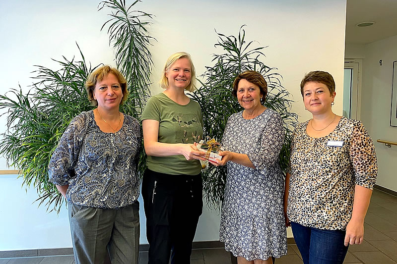 Strahlend übergaben Pflegedienstleiterin Ulrike Ollinger und die stellvertretende Pflegedienstleiterin Swetlana Vorrat vom Lina-Oberbäumer-Haus beide Geschenke an Pflegedienstleiterin Maria Schönberg und stellvertretende Pflegedienstleiterin Marina Minusin vom Hanse-Zentrum.