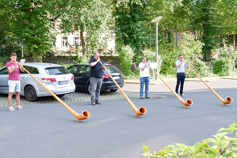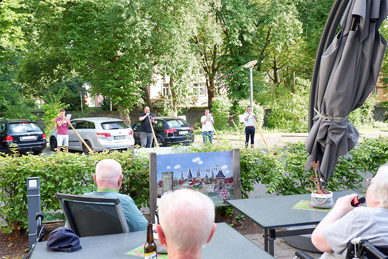 Bei schönstem Sommerwetter haben Mitte August die Alphornys aus Völlinghausen, Möhnesee, den Bewohnerinnen und Bewohnern des Hanse-Zentrums ein Feierabendkonzert bereitet. Das aus Holz gefertigtes Blechbasinstrument ist in der Form eines langen, konischen Rohrs, das am Ende wie ein Kuhhorn gebogen ist und in einen Schallbecher übergeht.