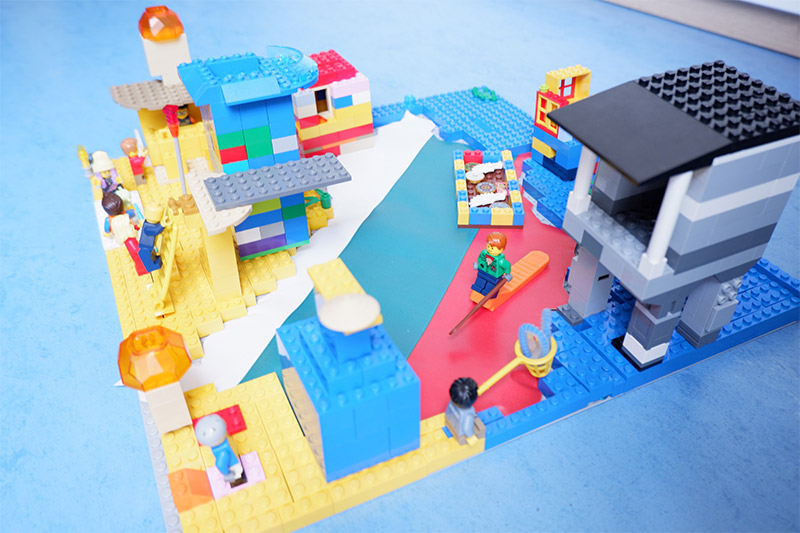„Die nächste Hürde war die uns zur Verfügung stehenden Steine in Ideen umzusetzen: Urlaub am Sand-Strand - mit der kindlichen Vorstellung, eine Schatztruhe zu finden, eine Strandbar, ein Sprungturm für kühne Sprünge ins Wasser, sowie der große Hafen Burgas…“