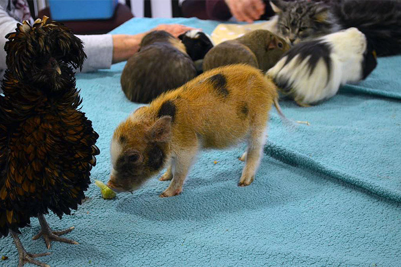 Das Minischwein war der Star des Tages und sorgte für viel Gelächter. Auch die beiden Hühner wurden sehr bewundert. Es wurde gestreichelt, gelockt, gefüttert, erzählt und gelacht, Erinnerungen und Beobachtungen ausgetauscht. Zwei Hunde, eine Katze, vier Meerschweinchen, zwei Kaninchen, ein Minischwein und zwei Hühner kamen Mitte April zu Besuch ins Soester Alten- und Pflegeheim Hanse-Zentrum.